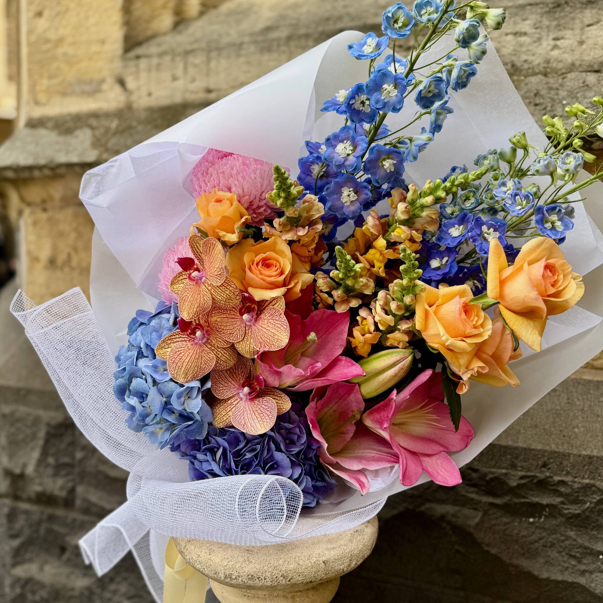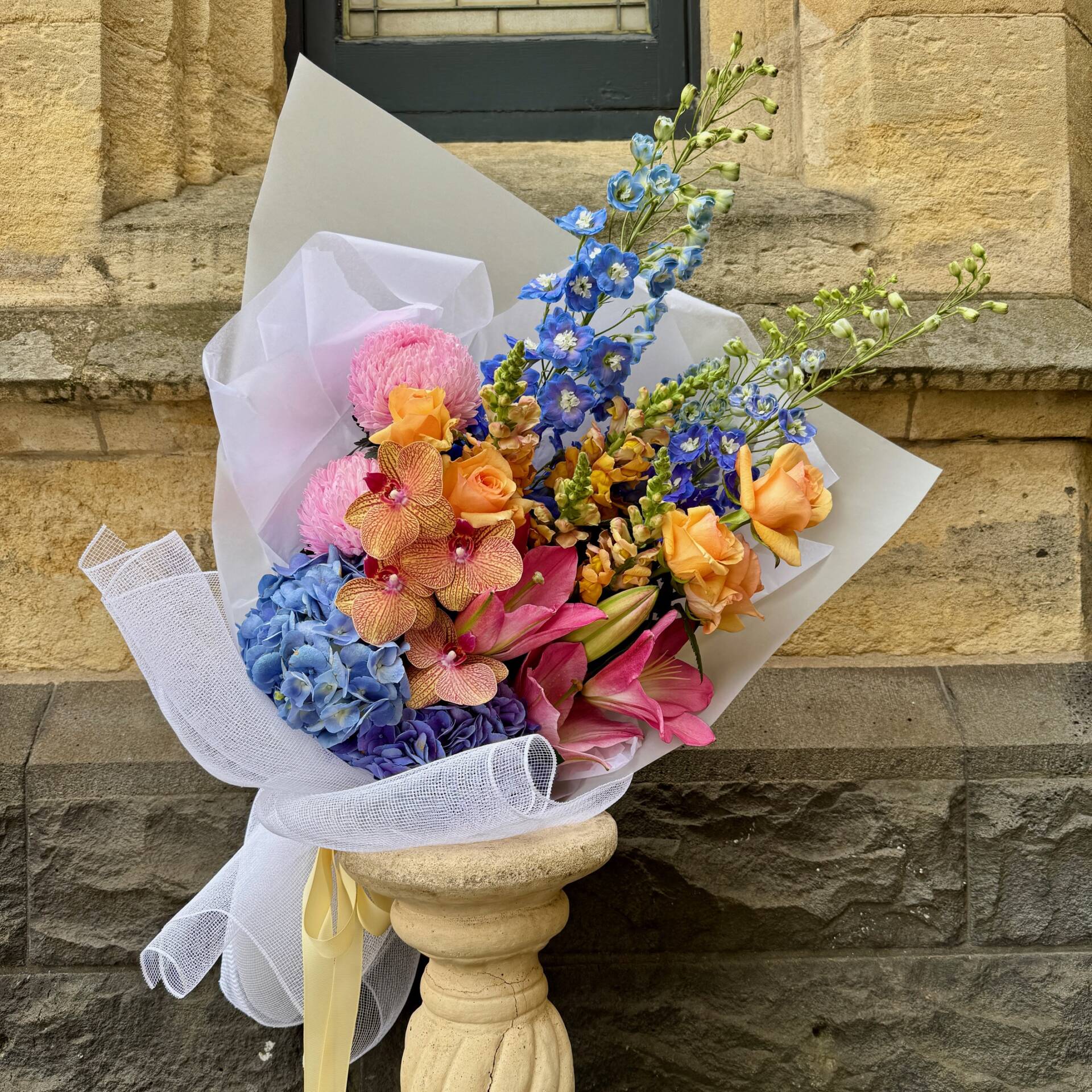 Our florists always choose the best seasonal florals to create your bouquet. With high demand at the market we cannot guarantee any specific floral varieties will be included in your bouquet, though please mention in the order notes any requests and we will do our best to include them.