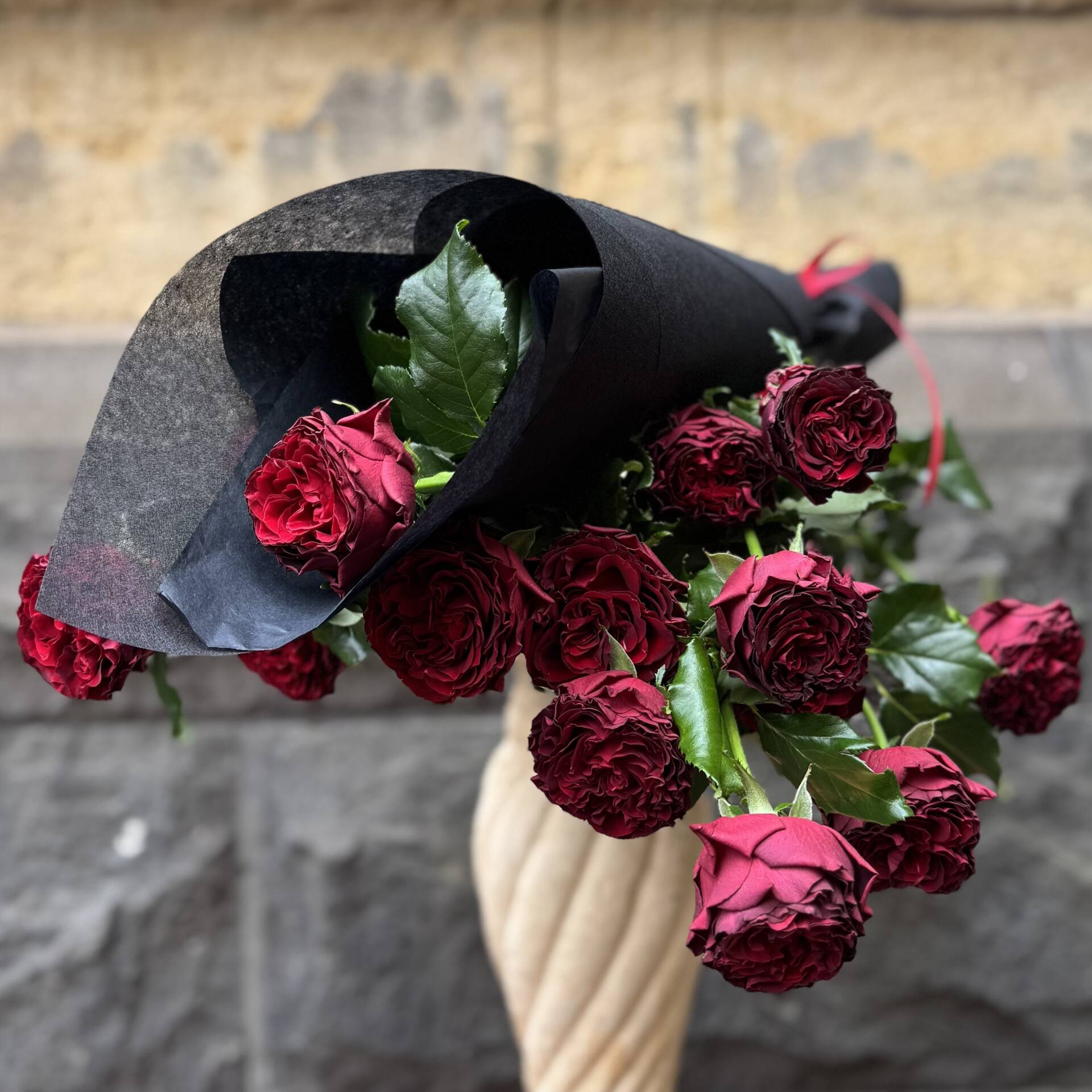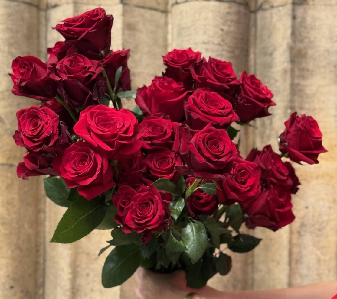 Our florists always choose the best seasonal florals to create your bouquet. Due to rose varieties being limited this time of the year we will contact you if the red rose variety pictured will differ in your order.